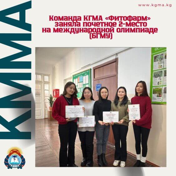 На этой олимпиаде от кафедры ФГЗ и ХЛС КГМА им. И.К. Ахунбаева приняли участие студенты 4-5 курсов факультета «Фармация» : Акылбекова Жазгул, Сагынбаева Акылай, Акунбаева Динара, Каныбекова Перизат, Осмоналиева Салтанат под руководством зав. кафедрой ФГЗ и ХЛС Мураталиевой А.Дж., Наматпаевой А.Р., Муратбековой З.М.