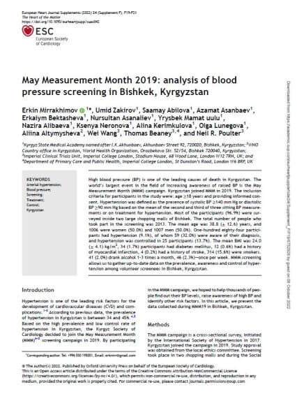 Артериальная гипертония (АГ) одна из наиболее часто встречающихся патологий и одна из ведущих причин смертности в Кыргызстане. Сотрудники кафедры факультетской терапии им. Вольского-Миррахимова провели исследование по измерению артериального давления (АД) 2013 участников в Торговых Центрах Бишкека. Средний возраст участников составил около 40 лет. 940 (46,7%) человек измерили АД в первый раз. Повышенное АД выявлено у 184 (9,1%) пациентов. Из них только 59 (32%) человек знали о наличии у них АГ. Гипотензивную терапию получали только 46 человек. Из них целевого уровня АД, только 25 пациентов достигли целевого уровня АД.