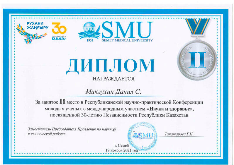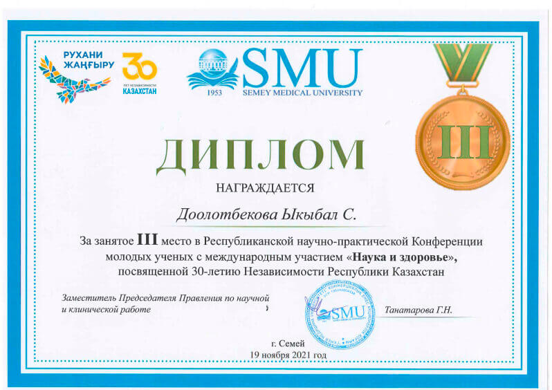 19 ноября 2021 года в НАО «Медицинский Университет Семей» прошла научно - практическая конференция молодых ученых «Наука и здоровье», посвящённая 30-летию Независимости Республики Казахстан с Международным участием. Направлениями для обсуждений на конференции были современное развитие гуманитарных и фундаментальных наук в медицине, вопросы общественного здравоохранения, гигиены, экологии через привлечение молодежи к участию в исследованиях и обмен научно-исследовательским опытом среди молодых ученых.