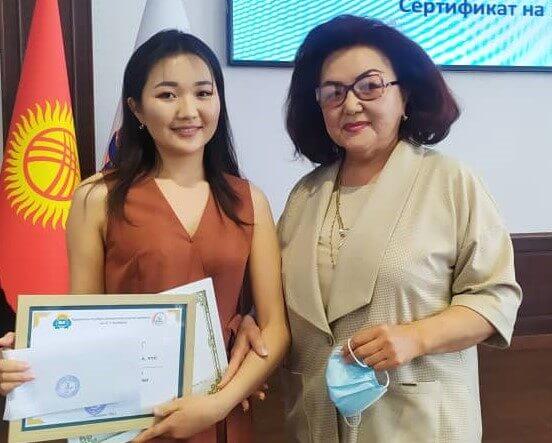 3 место – Кубанычбек кызы Назгуль. Течение и исход беременности у женщин с аномалиями развития внутренних органов. Кафедра Акушерства и гинекологии №1 КГМА. Научный руководитель к.м.н., доцент Теппеева Т.Х. – 4,55 баллов. Вручен сертификат на 10 тыс.сомов от фонда имени Сатынды Кожакматова.