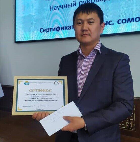 Кудаяров Эдилбек Кудаярович. Хирургияны кыргыз тилинде откутуунун койгойлору. Кафедра госпитальной хирургии с курсом оперативной хирургии КГМА. Научный руководитель Сопуев А.А. Вручен сертификат на 10 тыс.сомов от семьи Ахунбаевых.