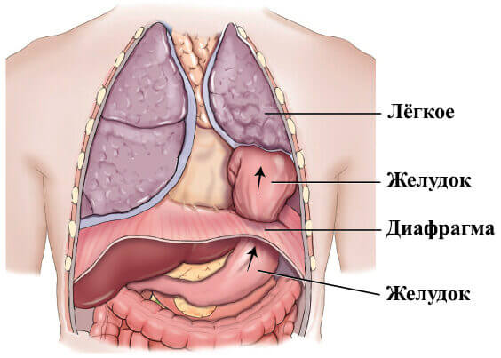 При релаксации диафрагмы наблюдается резкое истончение ее или отсутствуют мышцы в целом. В данном случае, у нашего пациента в результате релаксации диафрагмы купол вытянулся высоко в грудную клетку вместе с прилежащими органами брюшной полости, сдавив легкое, мешая полноценно дышать. В следствие чего, возникла одышка, также было ротация или смещение сердца в правую сторону.