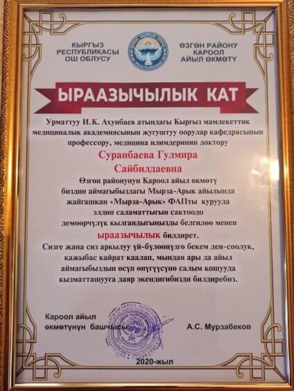 Профессор кафедры инфекционных болезней КГМА им.И.К.Ахунбаева Гульмира Суранбаева награждена благодарственным письмом Кароолского айыл окмоту Узгенского района и нагрудным знаком «Эл сыйлаган дарыгер» за оказанную финансовую помощь в реконструкции и оснащении фельдшерско-акушерского пункта села Мырза-Арык.