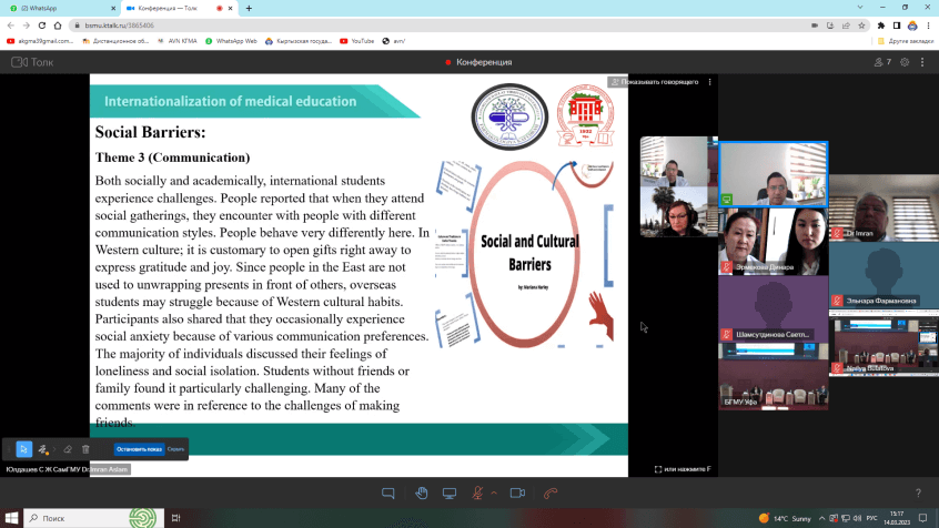 14 марта 2023 года в Башкирском государственном медицинском университете Министерства здравоохранения Российской Федерации г УФА в онлайн-офлайн формате прошла межвузовская учебно-методическая конференция с международным участием «Интернационализация медицинского образования: опыт, проблемы, перспективы». На котором приняли участие Самаркандский государственный медицинский университет, а также КГМА им. И. К. Ахунбаева кафедра фармакогнозии и химии лекарственных средств. Приняла участие Анарбу Джапаровна Мураталиева, заведующая кафедрой фармакогнозии и химии лекарственных средств, к.ф.н., доцент. Выступила с докладом к.ф.н. Эрмекова Динара Урматовна на тему «Академическая и социальная адаптация иностранных студентов к обучению в вузах». Была награждена сертификатом участника.