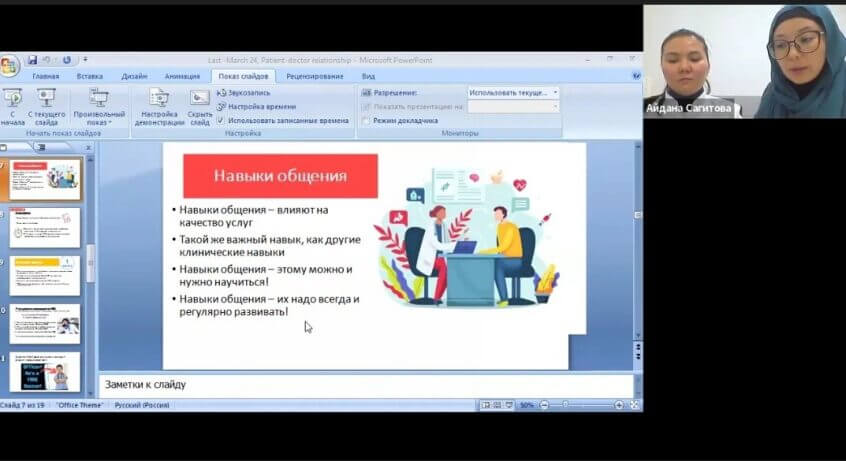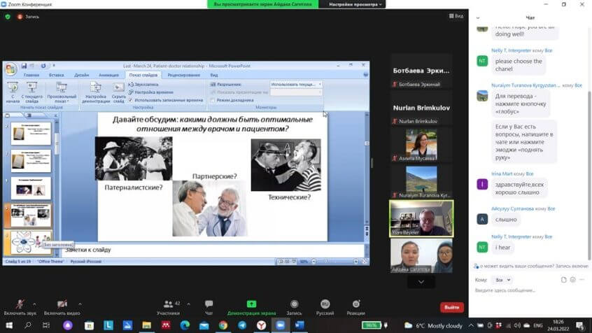 24 марта 2022 года в рамках сотрудничества КГМА им. И.К.Ахунбаева с проектом «Инициативы в медицинском образовании» и швейцарским фондом «Морис» (Женева, Швейцария) в целях повышения уровня знаний и навыков ординаторов, квалификации преподавателей кафедры семейной медицины последипломного образования (СМ ПДО), а также обмена мнениями среди ординаторов проведен онлайн мастер класс на тему «Отношения врача и пациента».