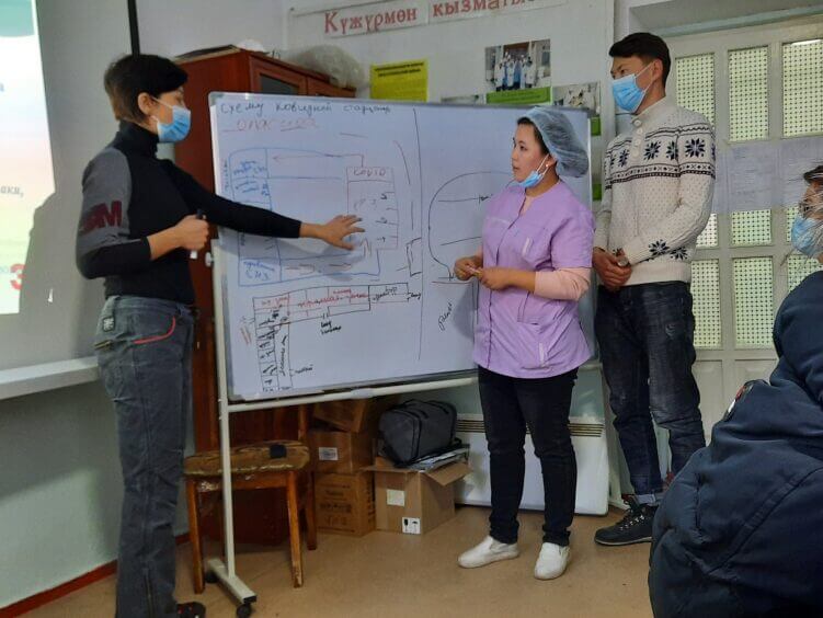 В связи с этим, с 24 по 27 ноября 2020 года команда тренеров - А. Иманкулова (к.м.н., зав сектором повышения квалификации КГМА), А.Шаршекеева (терапевт, Корпуса Мира), К.Тукешов (ассистент кафедры анестезиологии и реанимации КГМА), А.Баймендиева (врач пульмонолог, ОМС), Н.Туранова (ассистент кафедры семейной медицины постдипломного обучения КГМА) выехали в с.Ат-Баши Нарынской области для проведения практического тренинга для медицинских работников (врачей и медицинских сестер) и клинических ординаторов Ат-Башинской ТБ и ЦСМ.