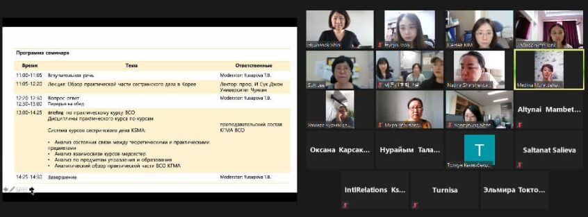 16 июля 2020 года прошел он-лайн семинар с представителями проекта «Улучшение практики сестринского образования в КГМА» от Университета Кенг-Хи в лице руководителя проекта проф.Шин Хен Сук. Тема семинара :Анализ практического курса СД в КГМА.