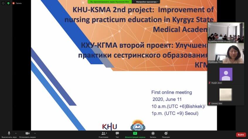 Сегодня, 17 июня 2020 года прошла он-лайн встреча с представителями партнерского университета Кенг-Хи (Южная Корея) во главе с профессором Шин Хен Сук и с ответственными работниками администрации КГМА имени И.К. Ахунбаева в лице проректора по международным связям и стратегическому развитию, профессора Гульмиры Джумалиевой, заведующей отдела международного сотрудничества Турнисы Юсуповой, а также с коллективом кафедры сестринского дела вуза.