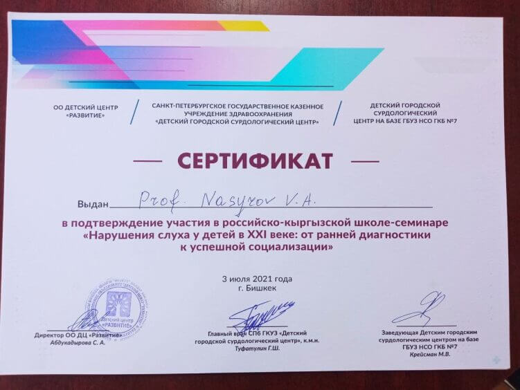 Заведующий кафедрой оториноларингологии КГМА им. И.Ахунбаева, д.м.н., профессор, заслуженный врач КР Насыров Вадим Алиярович получил Сертификат в подтверждение участия в российско-кыргызской школе-семинаре "Нарушения слуха у детей в XXI веке: от ранней диагностики к успешной социализации".