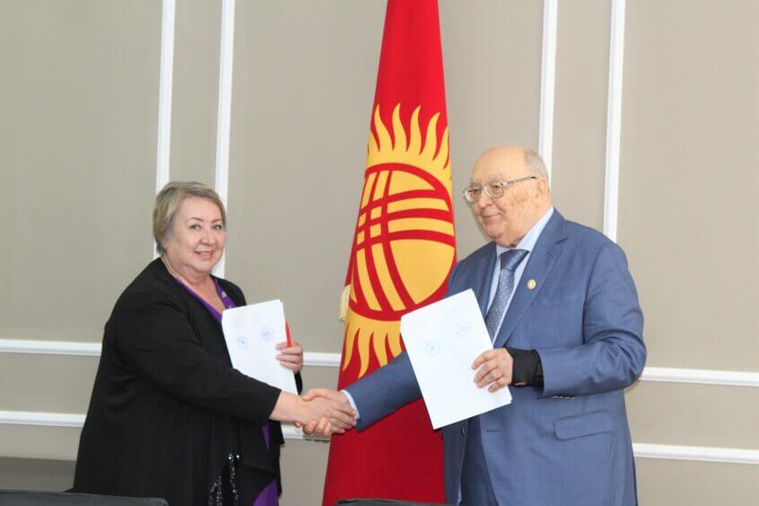 По окончании 2-ух дневной конференции в КРСУ, академики Мартыновым Анатолий Ивановичем и Мазуровым Вадим Ивановичем посетили КГМА, где встретились с ректором и профессором Кудайбергеновой Индирой.
