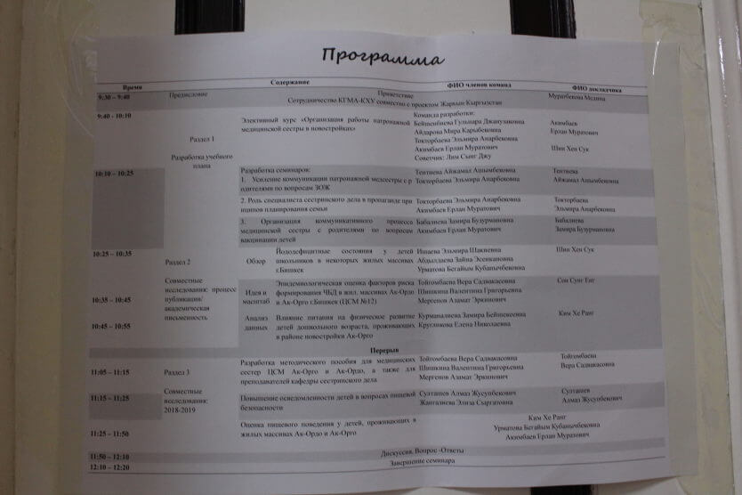 29 января 2019 года в КГМА имени И.К. Ахунбаева провели семинар на тему: «Организационная работа патронажной медицинской сестры в новостройках» с участием специалистов по организации работы медсёстер из Южно-корейского университета Кён Хи.