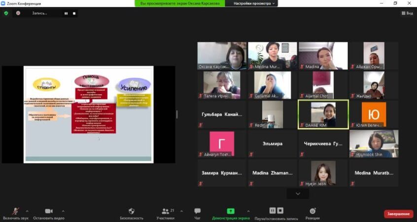 9-10 декабря 2020 года в КГМА имени И.К. Ахунбаева проводятся тренинги для преподавателей кафедры «ВСО» совместно с университетом Кенг-Хи (Южная Корея,) на платформе Zoom. Основными темами тренингов являются роль наставника и принципы практического обучения, организация обучения и проведения УПП, а также методы клинического контроля и оценивания, понятие о безопасной больничной среде и инструктаж.