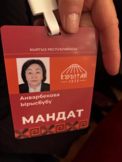 Доцент, кандидат медицинских наук, заслуженный врач Кыргызской Республики Анварбекова Ирысбубу, основатель резидентуры по подготовке спортивных врачей и сотрудник кафедры клинической реабилитологии и физиотерапии КГМА им. И. К. Ахунбаева, выступила на Народном курултае в качестве избранного делегата от города Бишкек.