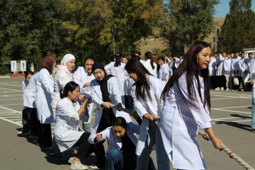 Для девушек - состязание "аркан тартуу" - перетягивание каната, а для парней - соревнование на быстрое реагирование по спасению раненых на поле боя.