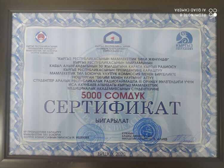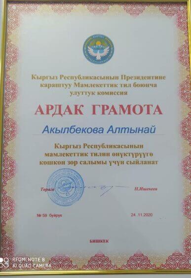 Необходимо также отметить, Алтынай Акылбекова была награждена грамотой Национальной комиссии по государственному языку при Президенте Кыргызской Республики.
