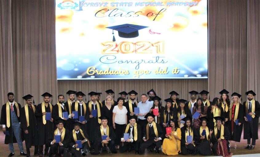 Сегодня, 6 июля 2021 года в конференц - холле Медакадемии состоялась торжественная церемония вручения дипломов иностранным выпускникам лечебного факультета. Всего в этом году лечебный факультет выпустил 67 специалистов, которые приехали на обучение в Кыргызстан из ближнего и дальнего зарубежья.