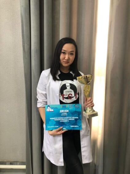 Во время прохождения цикла онкологии я обратилась к одному из лучших специалистов в онкогинекологии – Лим Евгении Федоровне, с которой мечтала поработать с 3 курса, с просьбой стать моим научным руководителем. Совместными усилиями мы проделали большую работу по осведомлению населения о такой актуальной проблеме как ВПЧ и в итоге получили 1 место среди научно-исследовательских работ студентов в 2022 году на международном конкурсе в КГМА в рамках «Дни науки 2022». А приз мне вручали такие известные и всеми уважаемые люди, как Ахунбаева Нелли Исаевна и Кудайбергенова Индира Орозобаевна, сказали много хороших пожеланий и напутственных слов. По-моему, это лучшая награда.