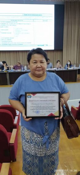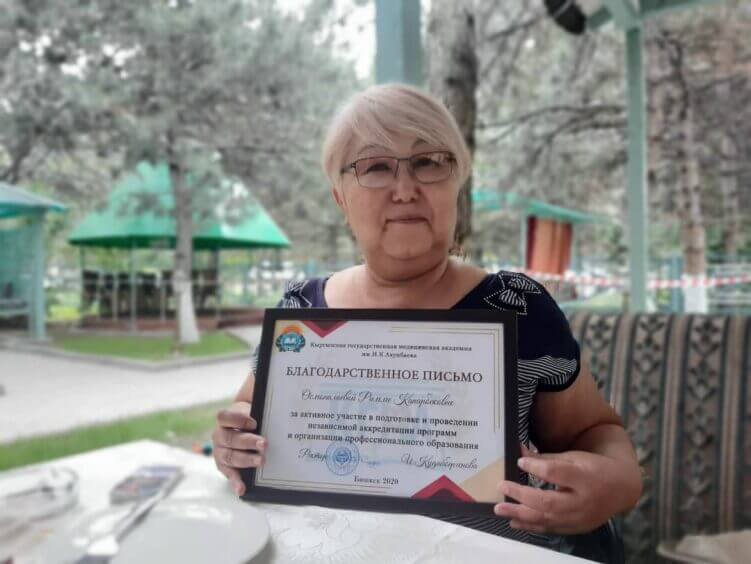 Сегодня, 18 июня 2020 года ректор Медакадемии Кыргызстана имени И.К.Ахунбаева, профессор Индира Кудайбергенова вручила благодарственное письмо отдельным преподавателям и сотрудникам вуза за активное участие в подготовке и проведении независимой аккредитации учебных программ