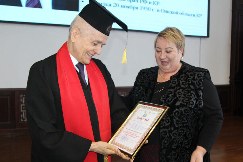 Велика его заслуга в развитии российско-кыргызских связей о области медицинской науки, практического здравоохранения и подготовки высококвалифицированных врачей. Кстати, об этом подробно рассказали во время церемонии вручения ректор КГМА Индира Кудайбергенова, член-корреспондент НАН КР, профессор Доктурбек Адамбеков и другие известные ученые, общественные деятели.
