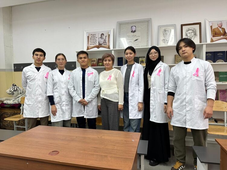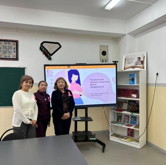 В честь месяца "Розовый Октябрь", ассистент кафедры общей гигиены Бейшеева Асел Кубанычбековна вместе с кураторской группой ЛД2-39гр.-3 курс, совместно с заведующей кафедры Джорбаевой А.А. и ассистентом Байбосовой Ч.К. посетили СОШ №91.