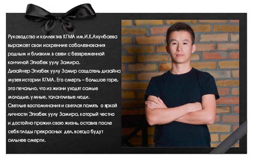 Руководство и коллектив КГМА им.И.К.Ахунбаева выражает свои искренние соболезнования родным и близким в связи с безвременной кончиной Эгизбек уулу Замира.