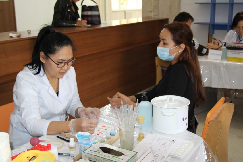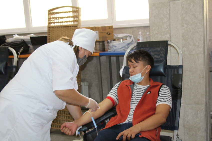 С 27 сентября по 1 октября 2021 года в морфологическом корпусе Медакадемии Кыргызстана им.И.К.Ахунбаева идет акция "Дни безвозмездного донорства крови" среди студентов 1-6 курсов, а также сотрудников. После определенных подготовительных работ, а именно, осмотра потенциальных доноров терапевтом: определения гемоглобина, определения группы и резуса принадлежности, исследования крови донора на признаки инфекций, осуществляется непосредственная сдача крови.
