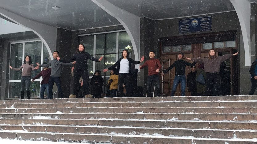 На днях студенты Медакадемии Кыргызстана имени И.К. Ахунбаева провели флешмоб в поддержку соблюдения чистоты и порядка на общественных местах, прежде всего, в учебных корпусах и общежитиях. Они языком песни, танца и пластических движений призывали своих сверстников быть опрятными и аккуратными в быту, бережно относиться к общественному достоянию, уважать труд других людей.