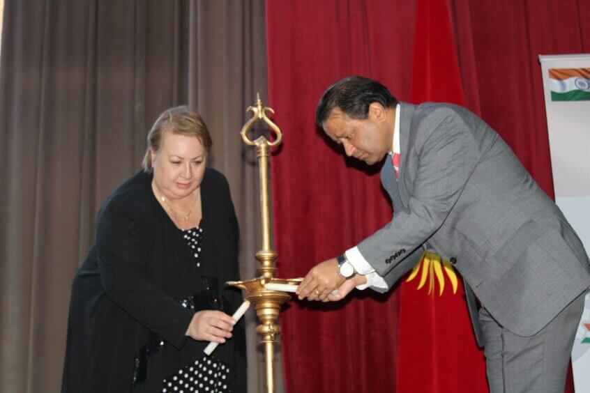 Ректор вуза, профессор Индира Кудайбергенова и господин Алок Димри выступили с приветственной речью, зажгли лампу и обменялись символическими подарками.